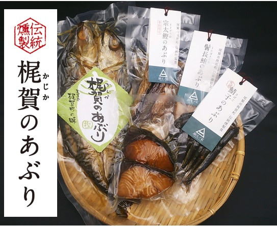 尾鷲の小さな漁師町に100年以上前から伝わる伝統保存食「梶賀のあぶり」。 桜や樫の生木を使い、梶賀漁港周辺で獲れた新鮮な魚を、 完全手作業で1時間以上かけて遠火で焼きながら煙でいぶした燻製の郷土食です。サバ、ソウダガツオ、ブリ(養殖)、ビンナガ等、その季節の魚を使ったあぶりをセットにしてお届けします。串、開き、切り身から2種、食べきりパック3種の計5品です。