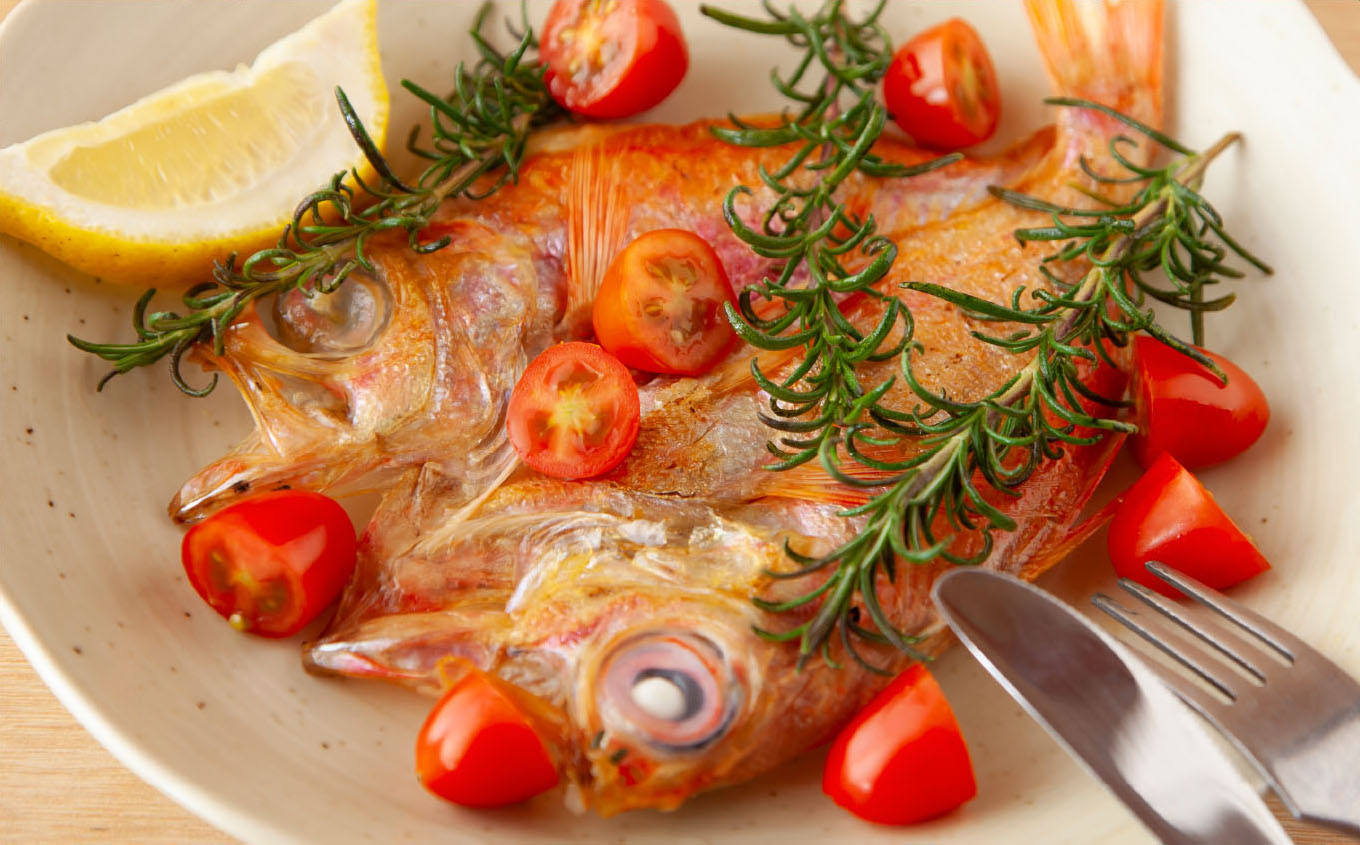 大さじ2のオリーブオイルとローズマリー、にんにくのみじん切りを火にかけ、干物の中まで火が通るよう中火でしっかりと両面を焼いたら、塩ひとつまみと粗挽き胡椒少々をふり、トマトとレモンを盛り付けました。あっという間にできるのに金目鯛の旨みが凝縮されたおしゃれで美味しい一品の出来上がりです。