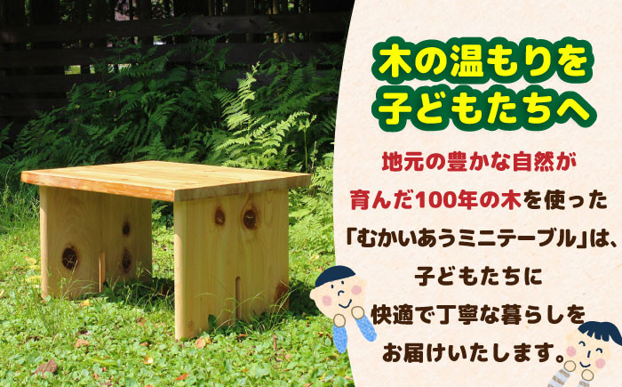 太い丸太を製造する際に、副産物として生まれる板を利用した子供向けのミニテーブルです。高さは一般的な座卓と同じのため、大人の文机としても使えます。 仲良く向かい合って使うイメージで「むかいあう」と名付けました。作る楽しみも感じてほしいので、ドライバー1本でできる組立式です。 100年近く続く地元の木を身近に触れてもらい、木を通じて快適で丁寧な暮らしをお届けいたします。 商品には「humming」のブランドロゴが押してあります。「humming」とは、ノッティーハウスリビングの子ども家具ブランドです。 ※画像はイメージです。 ※天然木のため、収縮する場合が稀にございます。到着後、お早目に組み立ててください。木の不具合があれば、お問合せください。