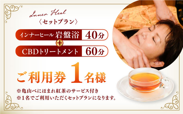 | 容量 | ・インナーヒール(お一人様用岩盤浴) 1名様 40分 ・CBDトリートメント 1名様 60分 ※1名でご利用いただくセットプランになります。 ※亀山べにほまれ紅茶のサービス付き |