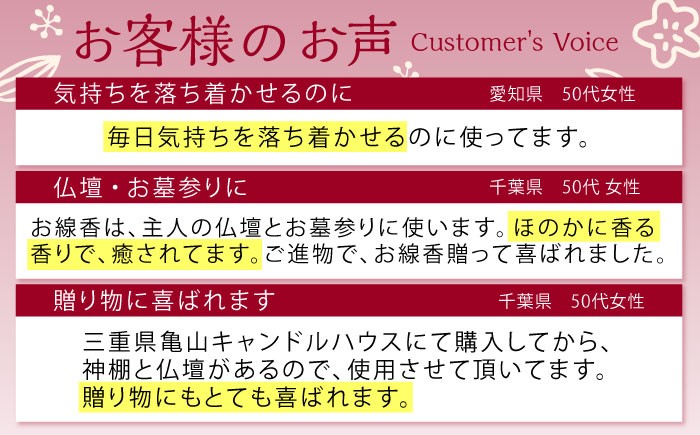 亀山の地で創業してから90余年。地域の皆様に愛され成長を続け、今ではローソク・キャンドルの国内シェアトップ企業に。誕生を祝うバースデーキャンドルから、供養の線香・ローソクに加えLEDキャンドルまで製造する。