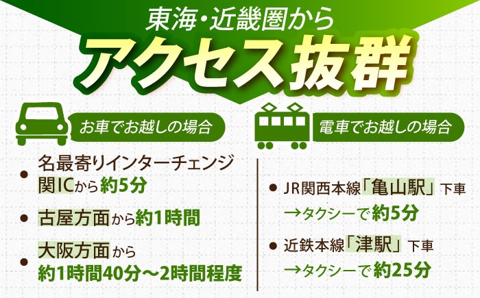 亀山市は、三重県の北中部に位置し、県内の主要都市である津市や四日市市、鈴鹿市からは20km圏内に、名古屋市から約50km、大阪から約100kmに位置しています。
