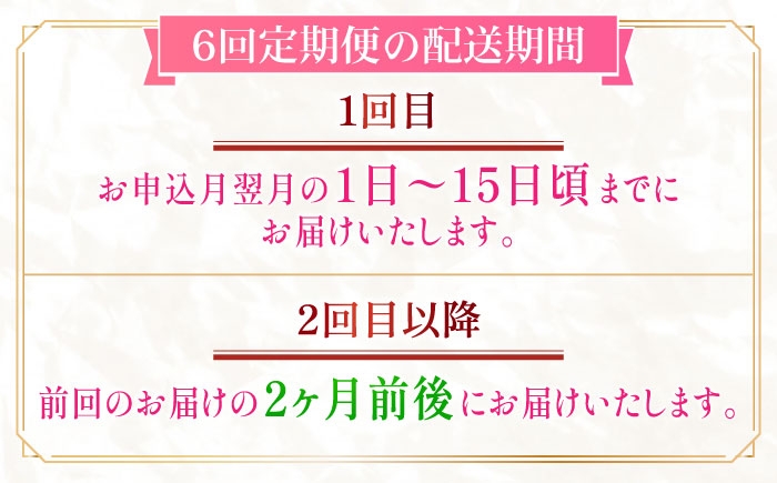 【3回定期便】 1回目:入金月翌月の1日〜15日頃までにお届けいたします。 2回目以降:前回のお届けの3ヶ月前後にお届けいたします。 【6回定期便】 1回目:入金月翌月の1日〜15日頃までにお届けいたします。 2回目以降:前回のお届けの2ヶ月前後にお届けいたします。 |