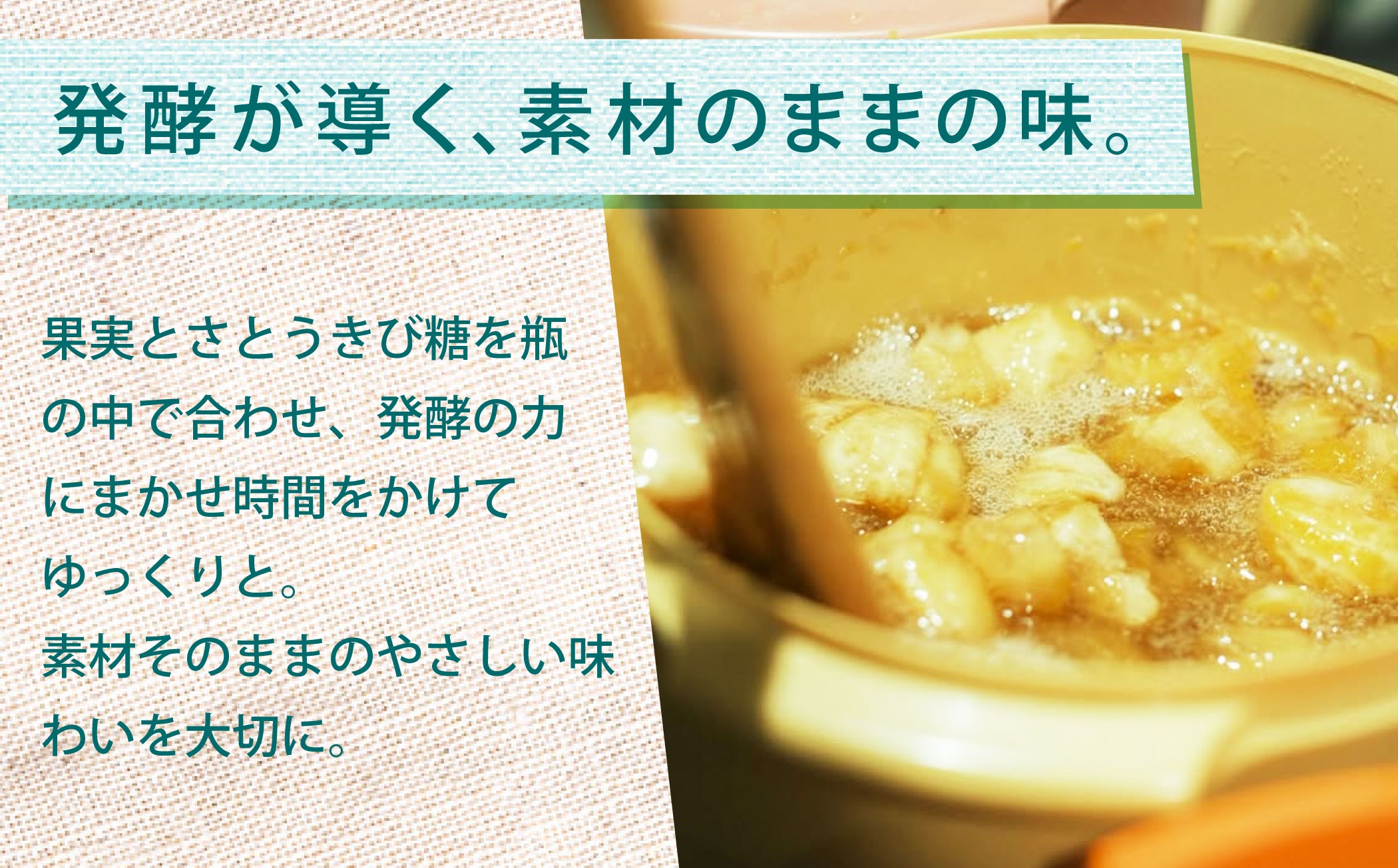 果実と糖を大きな瓶でじっくり発酵させ、素材が自然に導かれる味わいを大切にしています。