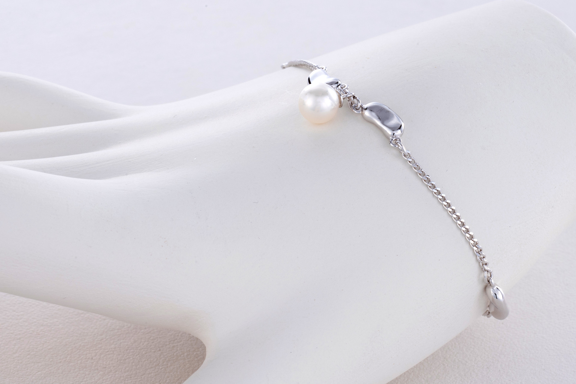 ビーンズシェイプのブレスレットです。中央のアコヤ真珠の美しさが華やかさを演出します。