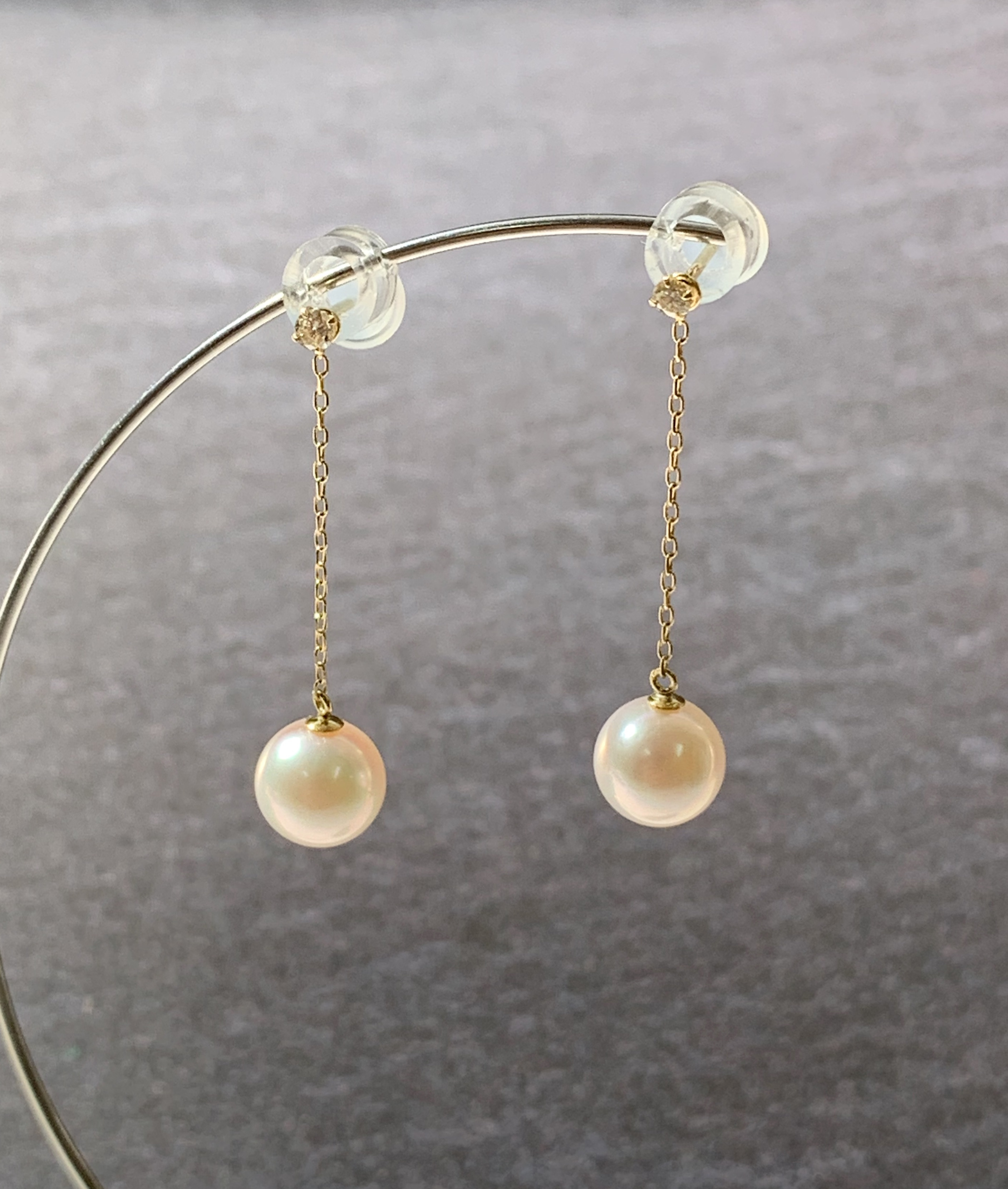 真珠専門店が厳選したあこや本真珠のピアスです。 あこや真珠がチェーンにより軽やかにゆれ、ダイヤモンドの輝きが華やかなピアスです。