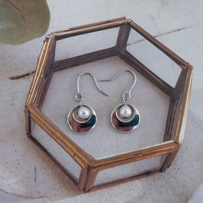 4.0㎜のあこや本真珠バロック(無調色系)の周りに可愛らしくデザインされたサークル。少し小ぶりで、ゆらゆら揺れるひっかけタイプのピアスにいたしました。真珠は、バロック(小キズやえくぼ有)なので、画像はサンプルだとお考え下さい。デザイン部分の大きさは、直径約10㎜です。横から見ると、少し厚みがあり、上から下に