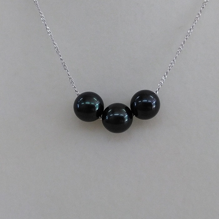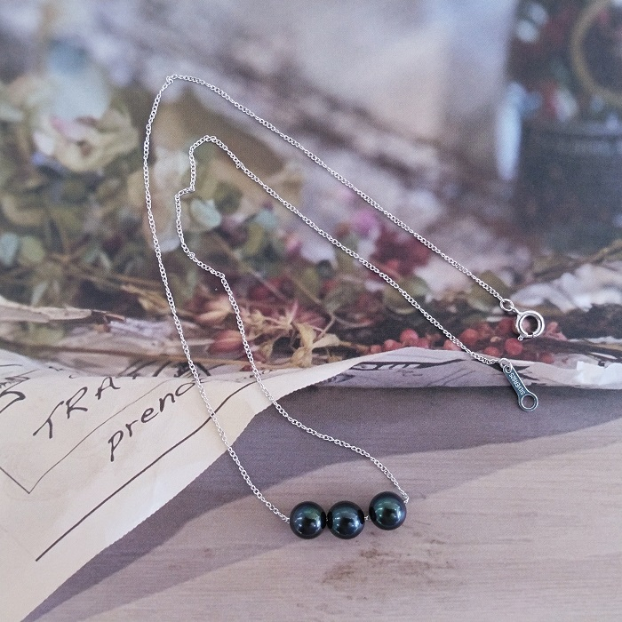 ちょっと訳ありの6.5㎜黒色あこや本真珠3珠のシンプルなネックレスです。 20-32伊勢志摩あこや本真珠スルーネックレス・3珠ブラックSV製