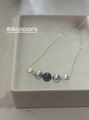 ちょっと目立つ、えくぼやでっぱり、色やテリのむら、しわなどがあり、高級なフォーマルネックレスには、使えない真珠たち。でも、養殖業者さんが、我が子のように一生懸命大切に育てた、真珠です。何とか皆さんに、使っていただけたらと思い、3色5珠のスルーネックレスに仕上げました。6.5㎜のあこや本真珠の黒色(染色処理)1珠とグレー色(コバルト処理)2珠とホワイト・ピンク系2珠です。40㎝のシルバー製チェーン(変色防止加工済み)を使用しています。。