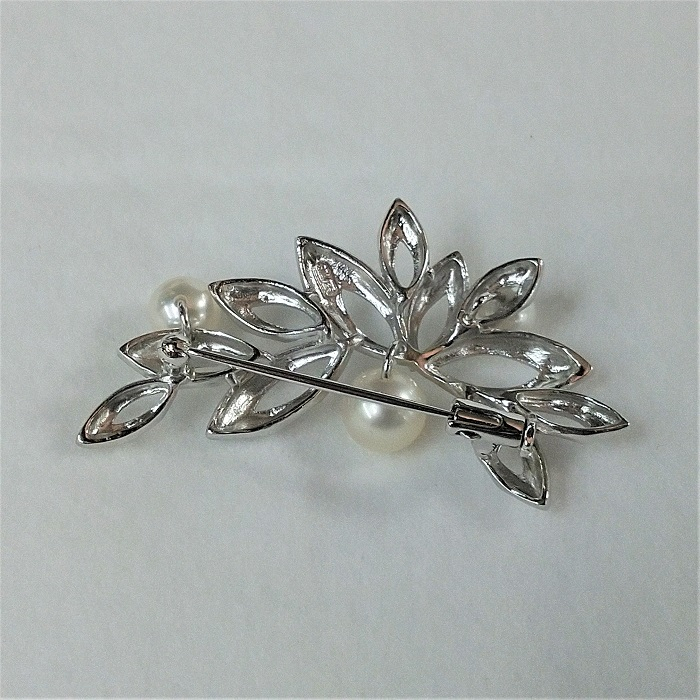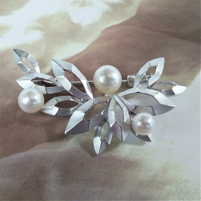 あこや本真珠が3珠アレンジされて少しハードな感じのブローチです。 150-09伊勢志摩あこや本真珠ブローチ(3珠葉っぱ)
