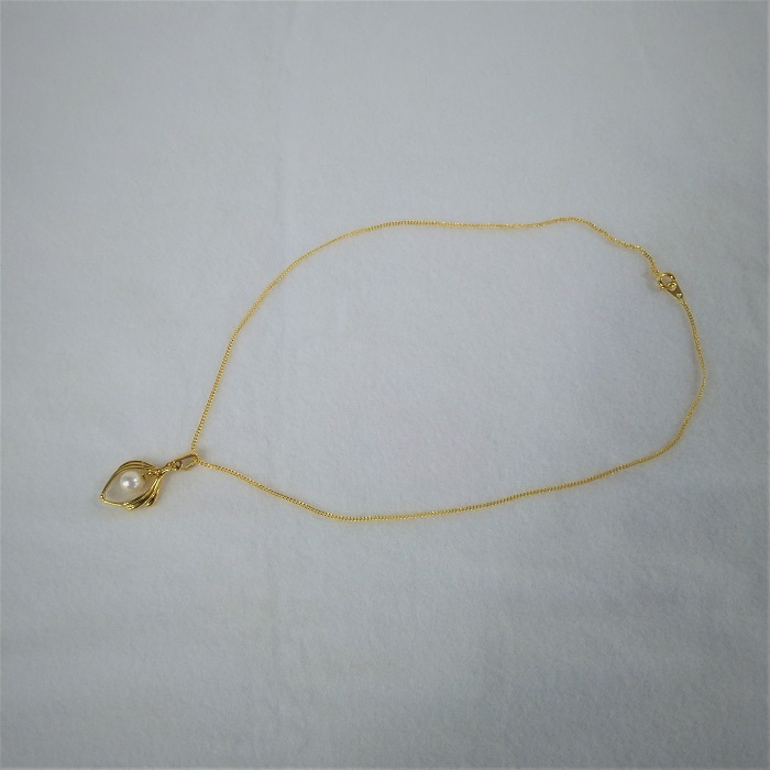 ちょっと目立つ、えくぼやでっぱり、色むら、しわなどがあり、テリも少し弱い、フォーマルネックレスには、使えない真珠たち。でも、養殖業者さんが、我が子のように一生懸命大切に育てた、真珠です。何とか皆さんに、使っていただけたらと思い、ペンダントにいたしました。6.0㎜のラウンドではない真珠です。訳ありの部分が、正面からは、なるべく見えないように、仕上げました。デザイン部分の大きさは、約16㎜×約22㎜です。チェーンの長さは、約40㎝です。ペンダントとチェーンは、真鍮製ですが、変色防止のゴールドメッキ処理が施されています。