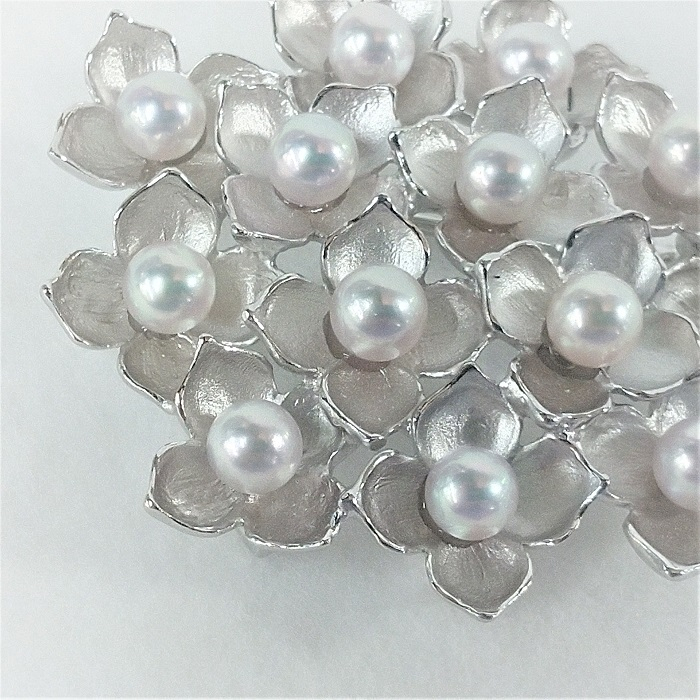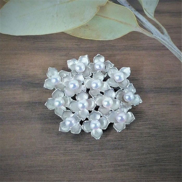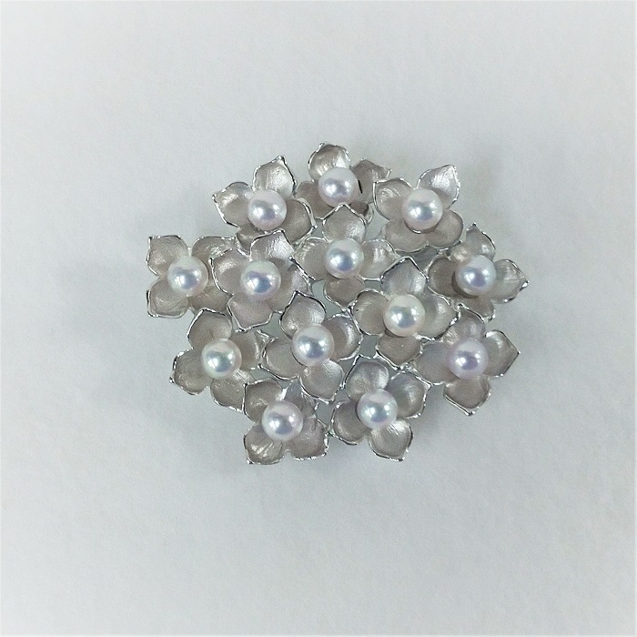 きれいな小粒のあこや本真珠がいっぱいのあじさいのブローチです。 200-17伊勢志摩あこや本真珠ブローチ・あじさい(B02)