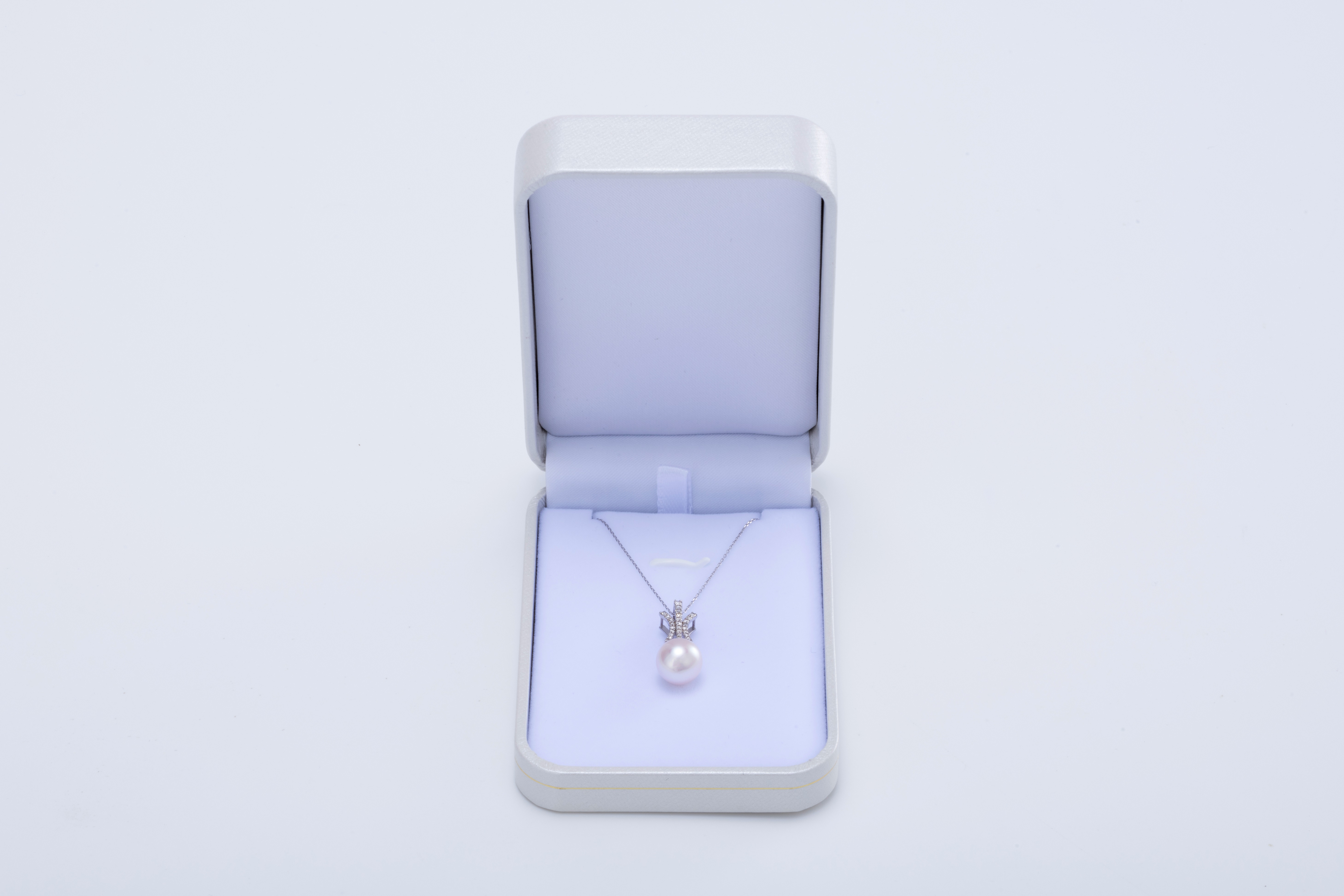 あこや真珠約10mmのK18WG製ペンダント。大粒なあこや真珠の輝きとダイヤモンドが調和する華やかな印象のペンダントです。