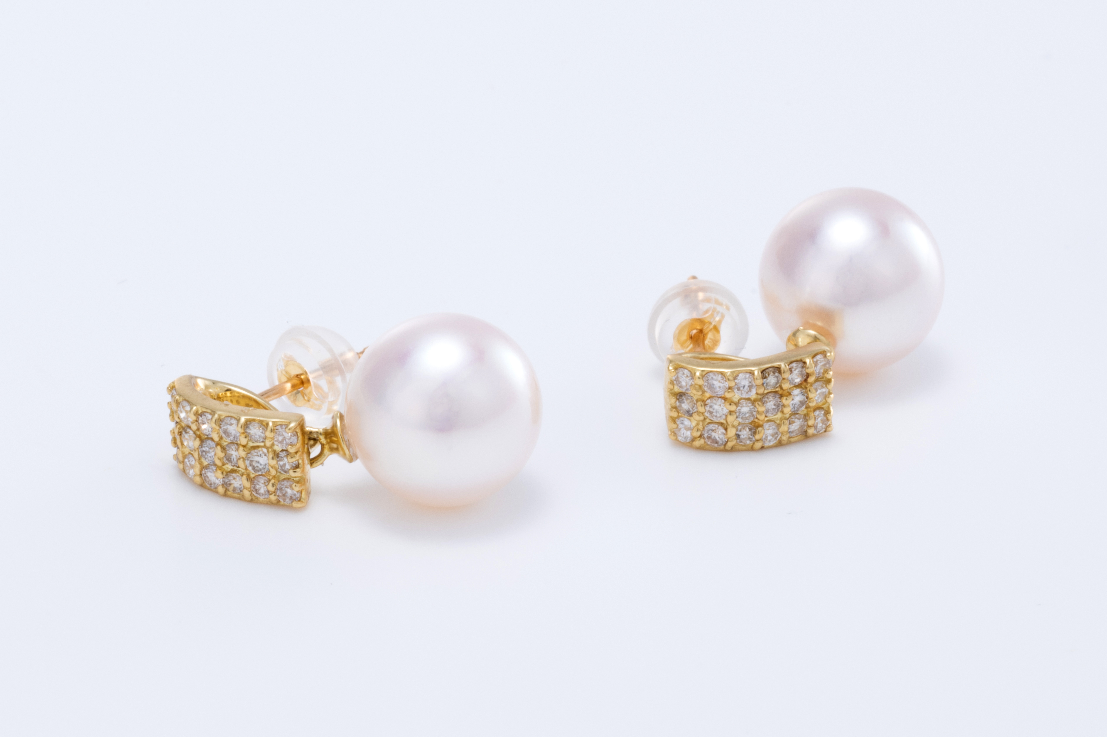 あこや真珠約10mmのK18製ピアス。あこや真珠の輝きを際立たせるダイヤモンドをセッティングしたピアスです。