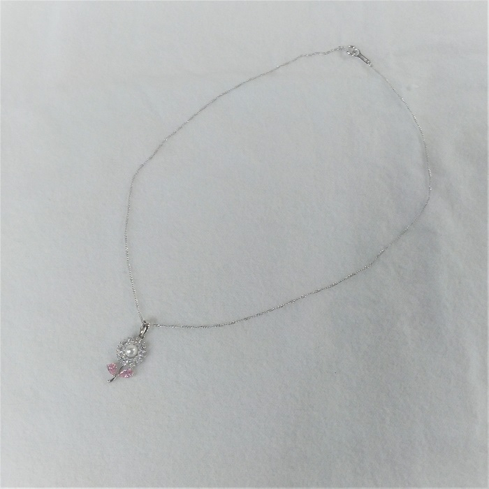 ピンクのキュービックジルコニアがアクセントのキュートなペンダントです 25-24伊勢志摩あこや本真珠ペンダント・フラワー