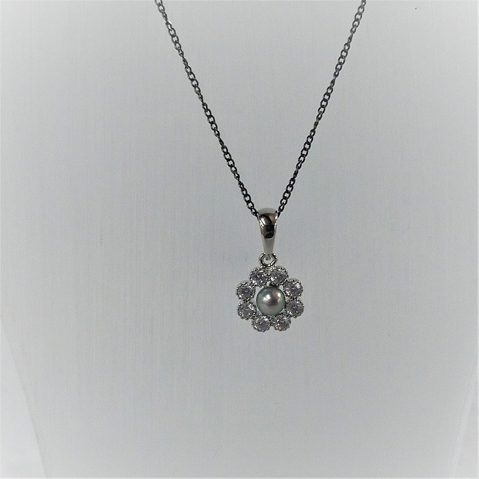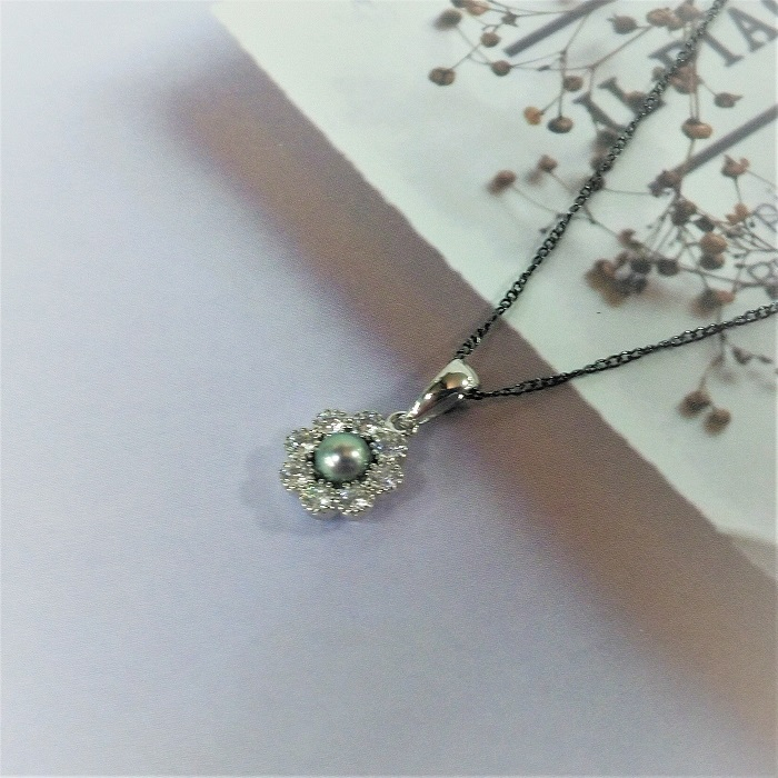 3.5㎜のあこや本真珠の処理珠が一粒。花びらモチーフのちっさなペンダントです。デザインが小さいので、画像をよくご確認下さい。デザイン部分の大きさは、直径約10㎜です。ペンダントとチェーンはSV製です。ペンダントには、ロジウム加工が、チェーンには、ガンメタカラー加工が施されております。チェーンの長さは、約40㎝です。
