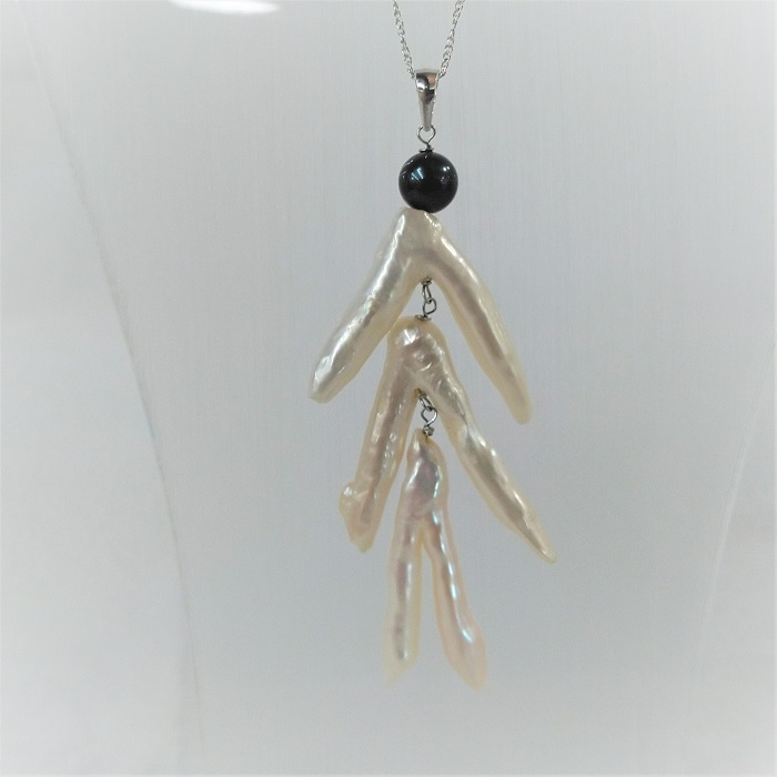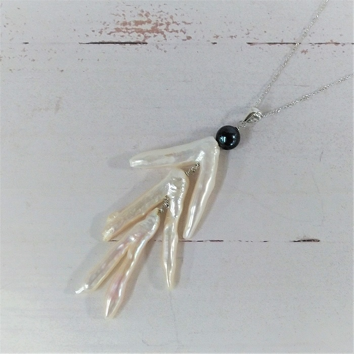 池蝶本真珠のバロックとブラックあこや本真珠(処理珠)でオリジナルのペンダントにいたしました。地元、赤崎神社の厄除けのスギの形に、枝の形の池蝶本真珠のバロックを3本、ゆらゆら揺れるように、ステンレス線でつないで、あこや本真珠のブラックを上にひと珠アレンジした、わたくしどものオリジナルです。45㎝のシルバーチェーンをおつけいたしました。バチカン金具もシルバー製です。