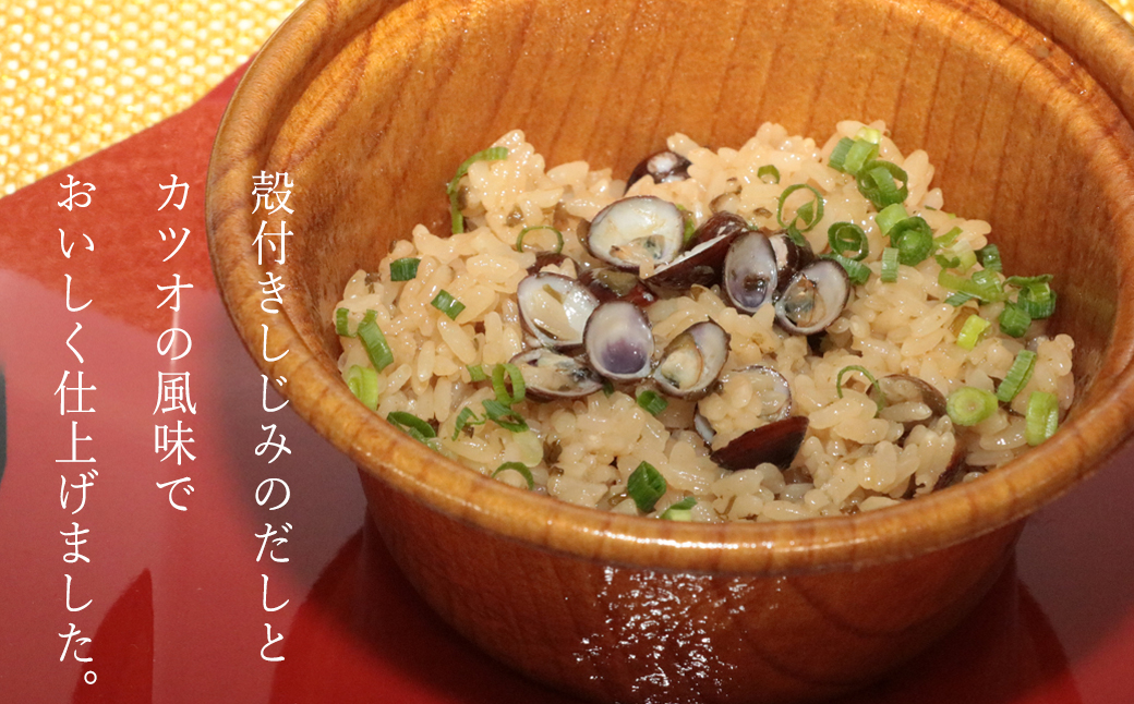 三重県産殻付きしじみのだしとカツオ風味でおいしく仕上げました。たっぷり入ったしじみのシンプルで風味豊かなご飯です。