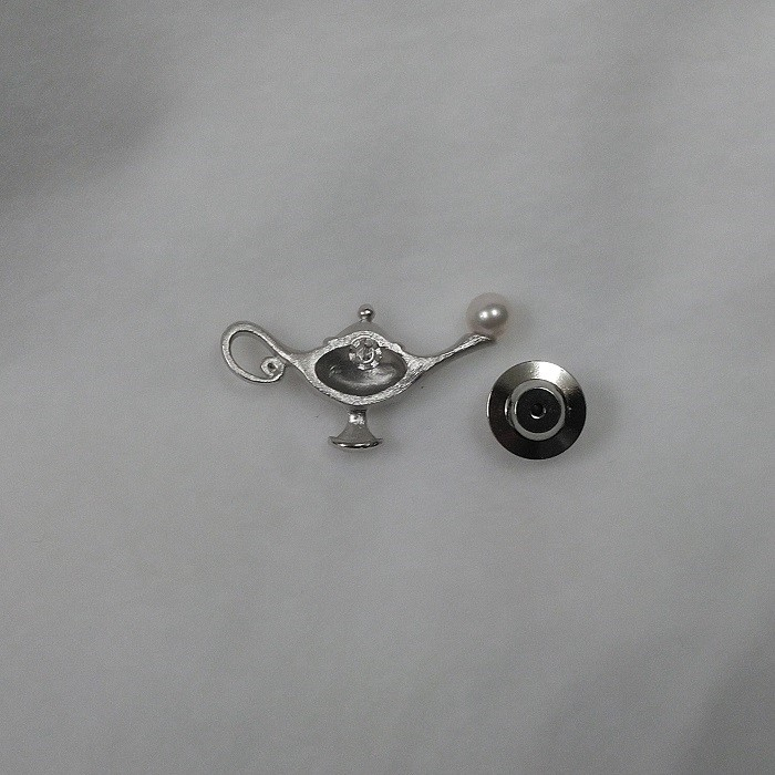 オシャレで、マジかわいい、シルバー製魔法のランプのピンブローチです。本当に、中から誰か出てきそうです。大きさは、約16㎜×約30㎜です。しっかりとした、あこや本真珠4.5㎜が1珠、ランプの口についています。金具の在庫が無い場合、加工に、45日程度お時間がかかることがあります。予め、ご了承ください。
