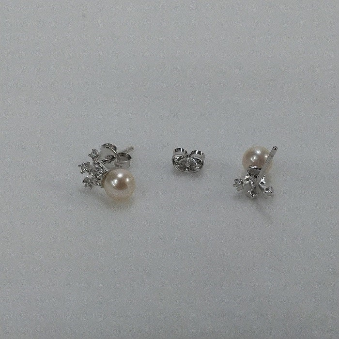 クラウンの形をしたシルバー製スタッドタイプピアスです。真珠は、ラウンド・セミラウンドの4.5㎜のあこや本真珠です。とびぬけて綺麗というわけではない、ごく標準的な品質の真珠です。ご理解いただけるとありがたいです。デザイン部分の大きさは、約6㎜×約5㎜です。キャッチもシルバー製です。金具には、変色防止のロジウムメッキが施されています。