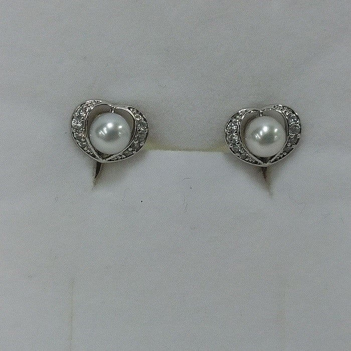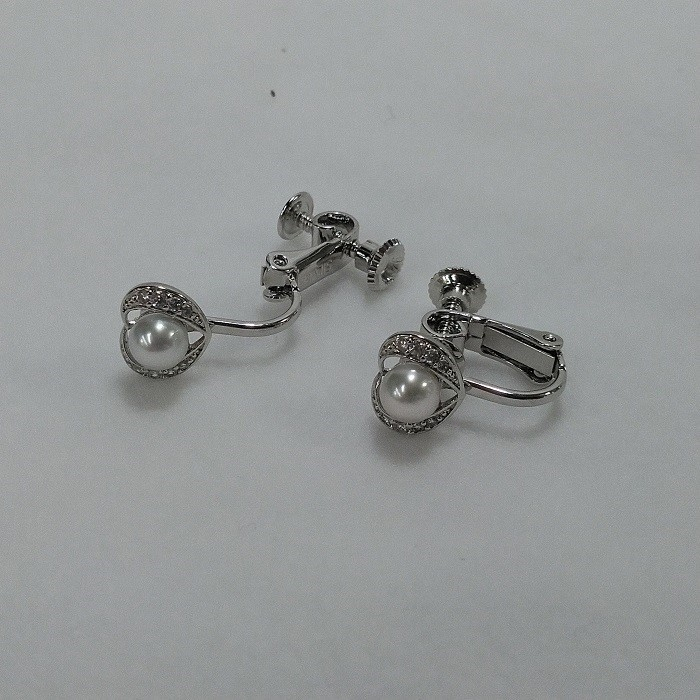 かわいらしいハートに、ジルコニアの入ったシルバー製ネジバネ式イヤリングです。真珠は、ラウンド・セミラウンドの4.5㎜のあこや本真珠です。とびぬけて綺麗というわけではない、ごく標準的な品質の真珠です。ご理解いただけるとありがたいです。デザイン部分の大きさは、約9㎜×約7㎜です。金具には、変色防止のロジウムメッキが施されています。