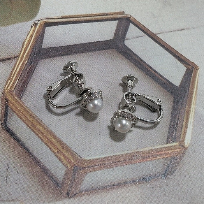 | 容量 | シルバー製イヤリング・ネジバネ式(デザイン部分 約9㎜×約7㎜) 1ペア あこや本真珠4.5㎜ 2珠 |