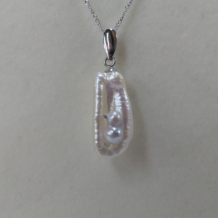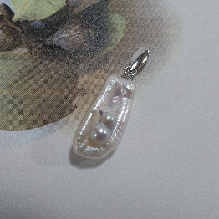 樹木のような感じの淡水本真珠バロックに、小鳥のように見えるあこや本真珠ナチュラル双子をくつっけました。樹木のほこらにキツツキがいるように、見えるかは、あなた次第です。よ~く、画像を確認ください。完全に自己満足のアクセサリーだとお考えいただけると助かります。シルバー製バチカン金具で、ペンダントにしました。真珠のサイズは、淡水本真珠(約10㎜~約15㎜)×(約20㎜~約25㎜)あこや本真珠(約2㎜~約4㎜)×(約4㎜~約8㎜)とも、個体差がとっても大きいです。ご了承ください。サンプル画像があります。シルバー製チェーン(約40㎝)がついています。