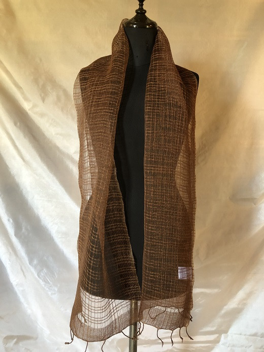 縦糸と横糸の太さを変えて格子模様に織られた透明感のあるストールを、柿渋で染めてみました。