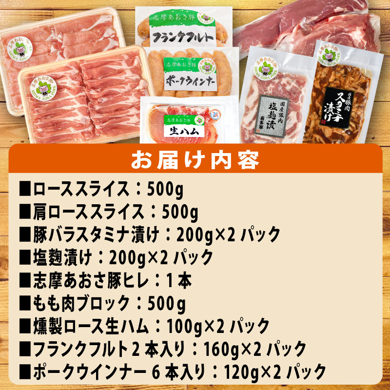 大容量 ブランド豚 バラエティセット 合計約3kg以上 しゃぶしゃぶ 焼き肉 フランクフルト ウインナー 豚肉 肉 ポーク 国産 ロース 肩ロース 豚バラ ヒレ モモ 豚丼 塩麹 スライス 薄切り セット 生ハム 燻製 おつまみ ワイン お酒 に合う 鍋 詰め合わせ 食べ比べ セット 50000円 五万円 5万円 伊勢 志摩 三重県 志摩あおさ豚Eセット 年末年始