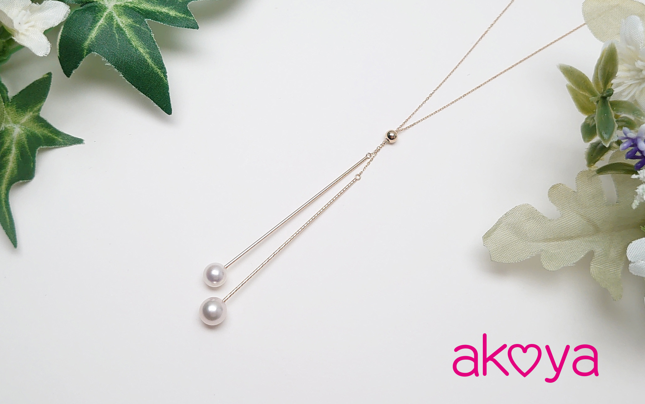 シリコンスライドボールで長さ調節が可能なので、自分好みのフィット感でお楽しみいただけます。2本のニュアンスの違うスティック金具の先端についたあこや真珠が、ちょっとした動きでも優雅に揺れる様子がアクセントとなります。