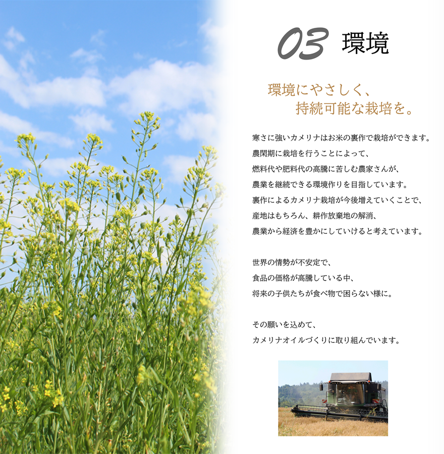 日本の「健やかな暮らし」を実現する為に、全国の農家さんと手を取り合い次世代の健康油「カメリナオイル」をお届けします。