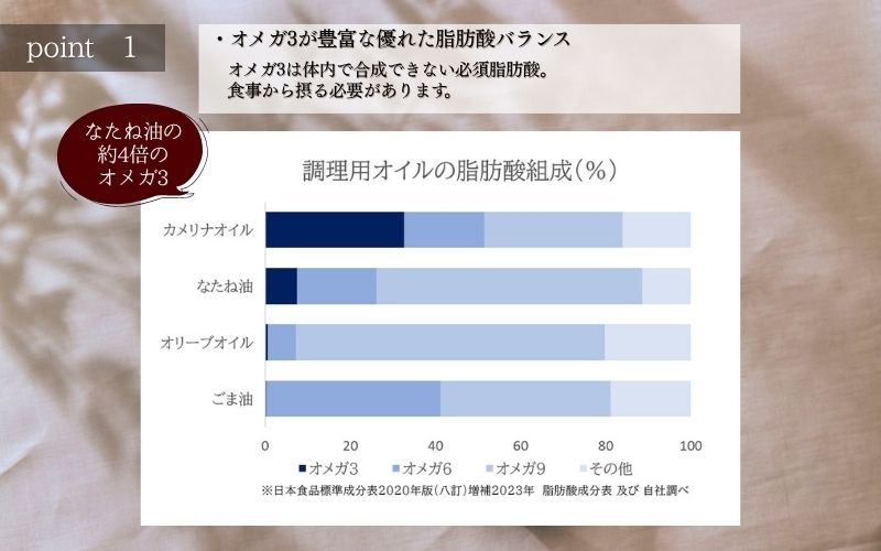 必須脂肪酸であるオメガ3・オメガ6と不飽和脂肪酸のオメガ9が2:1:2と身体に必要なバランスで含有されており、現代人に必要なオイルでもあります。人間の体内では作ることができない必須脂肪酸オメガ3(α-リノレン酸など)は身体の組織が正常に機能する上で欠かせない成分です。