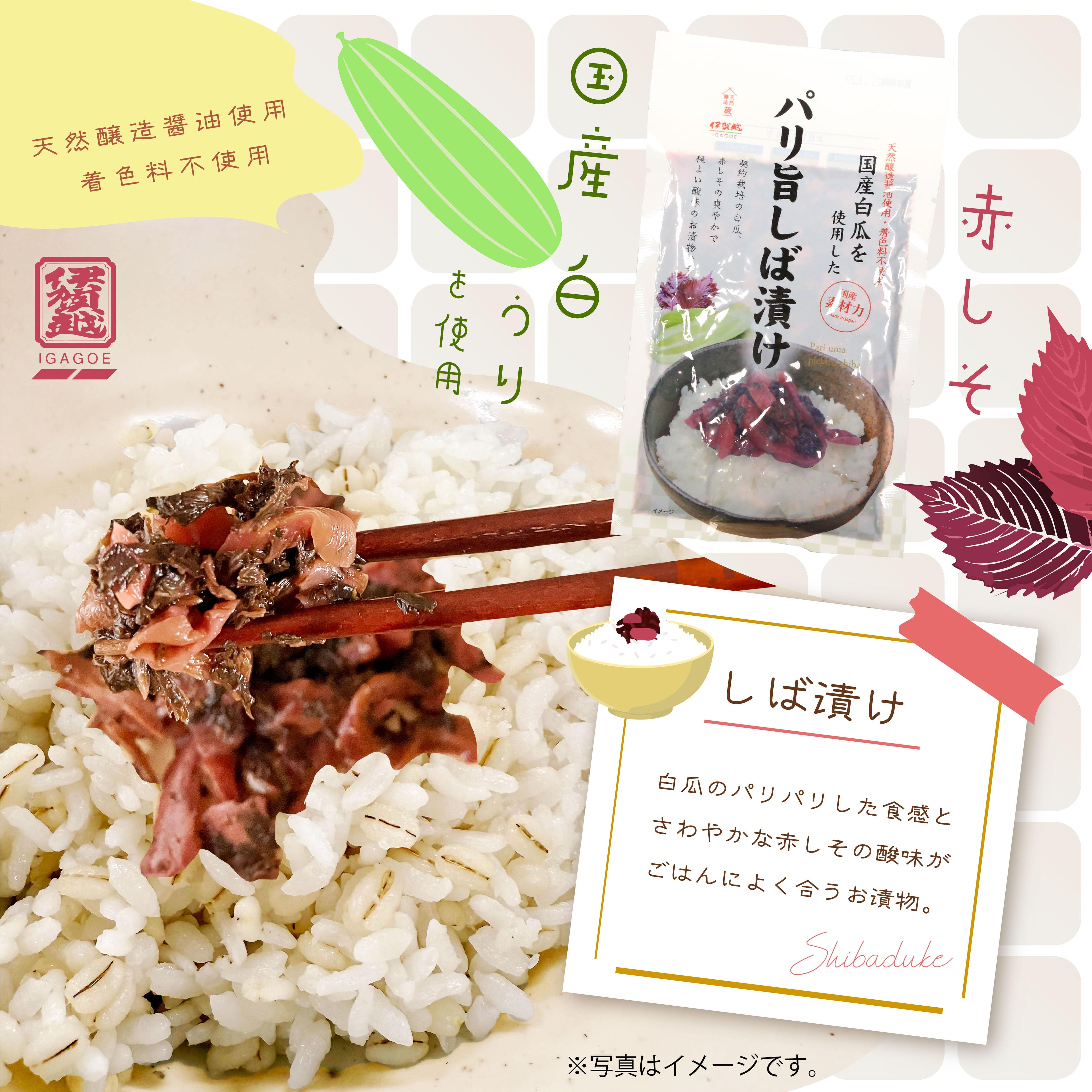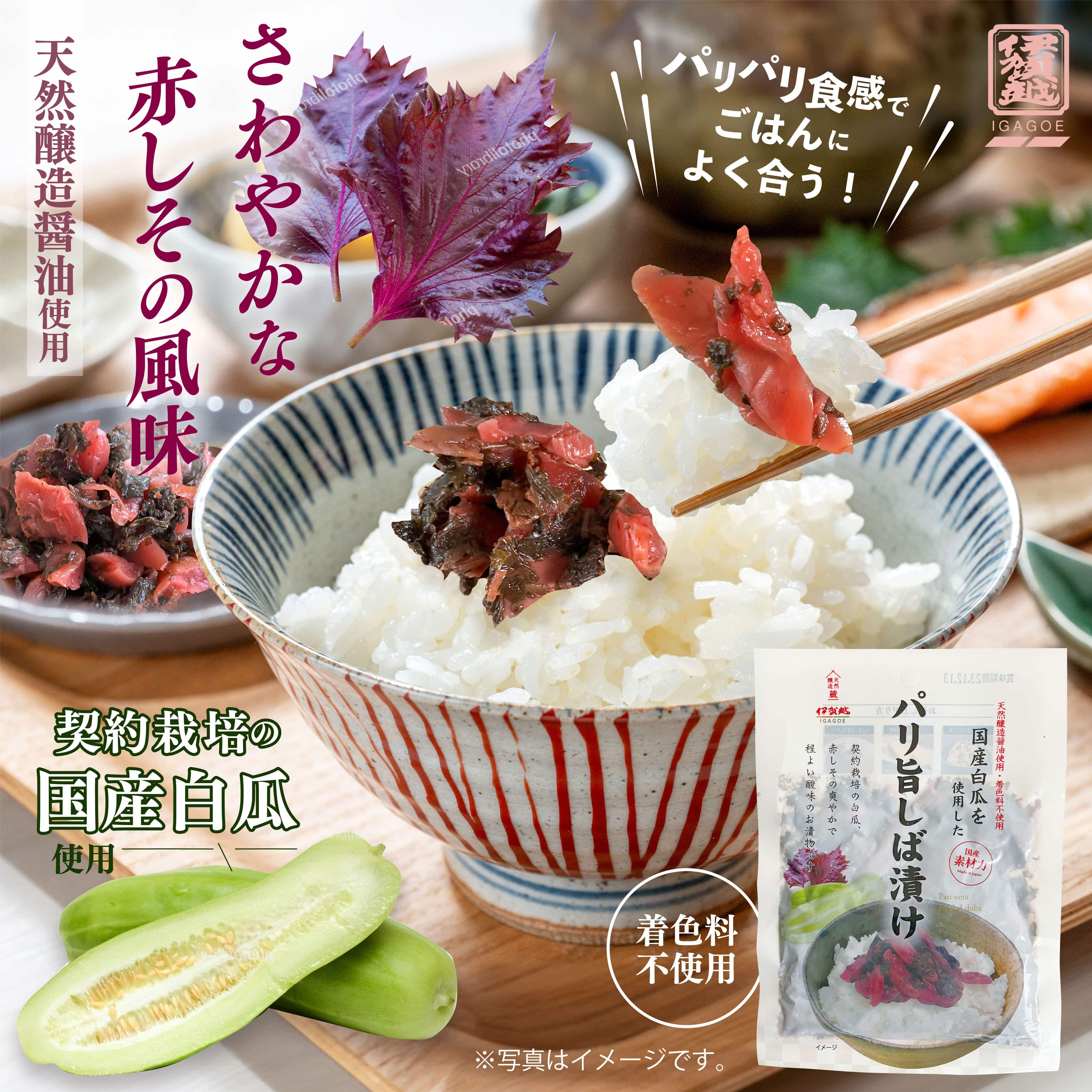 三重県の契約農家様に栽培いただいた白瓜と国産の赤しそを使用し、天然醸造醤油と、赤酢で漬け込んだ、お漬物。程よい酸味とパリパリした食感がご飯によく合います。
