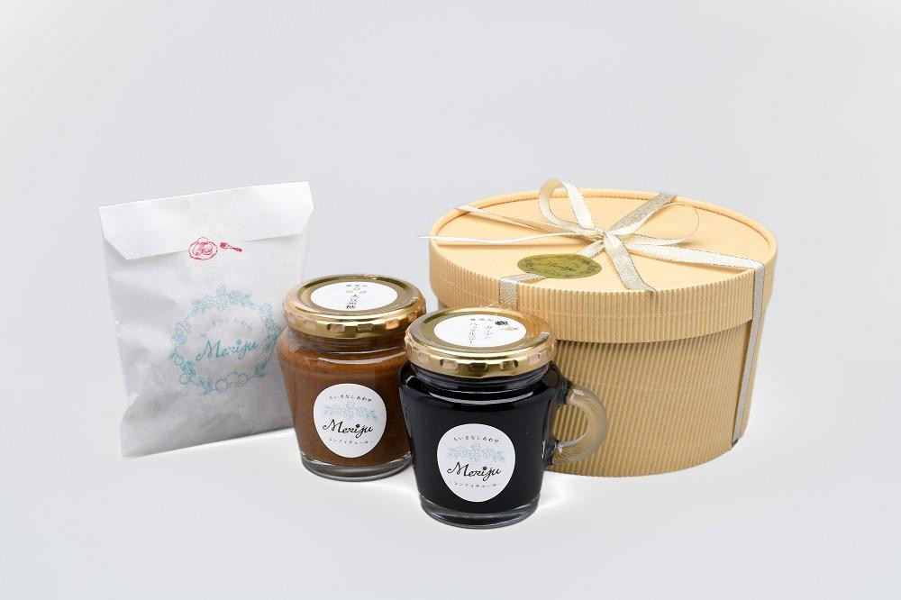 | 容量 | コンフィチュール ガーデン・ハックルベリー 大豆黒糖 各160g 各1本 計2本 キャラメル1袋 5個入 【化粧箱入り リボン包装(ギフト包装)】 |