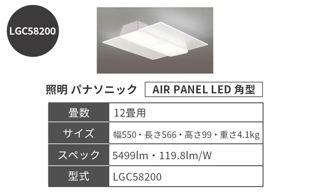 | 容量 | ・畳数:12畳用 ・サイズ:幅550・長さ566・高さ99・重さ4.1kg ・スペック:5499lm・119.8lm/W ・型式:LGC58200 ・リモコン付き |