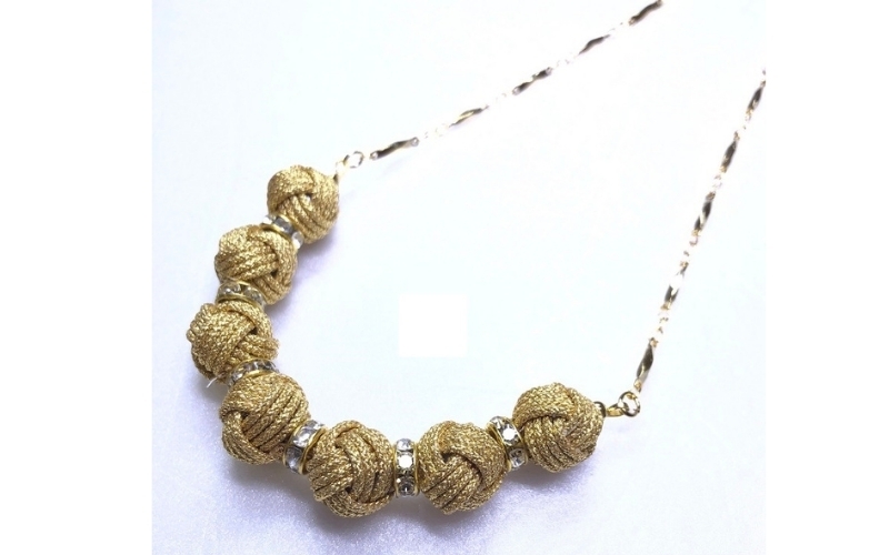 組紐の技術で約1mmの細い紐を作り、一つ一つ手でモンキー結びで丸い玉を作りました。肌あたりの良いネックレスに仕上がっています。とても軽く色合いも金、銀は服装を選ばず、様々な場面に活躍すること間違いない商品です。