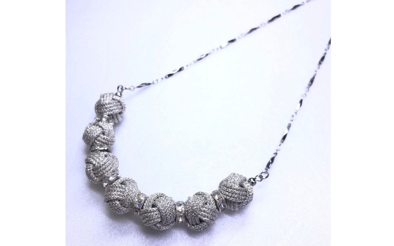 組紐の技術で約1mmの細い紐を作り、一つ一つ手でモンキー結びで丸い玉を作りました。肌あたりの良いネックレスに仕上がっています。とても軽く色合いも金、銀は服装を選ばず、様々な場面に活躍すること間違いない商品です。
