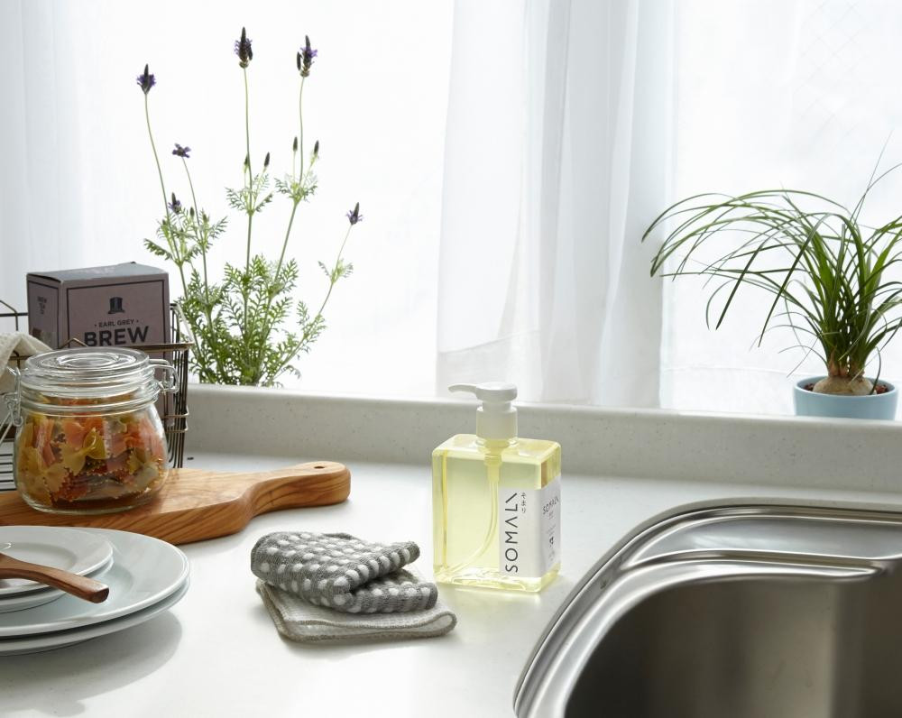 ほのかに香るオレンジ精油が心地よい SOMALIキッチンクリーナー、手肌への優しさが詰まった SOMALI台所用石けん、キッチンで大活躍のシンプルなかやおりふきんをセットにしました。