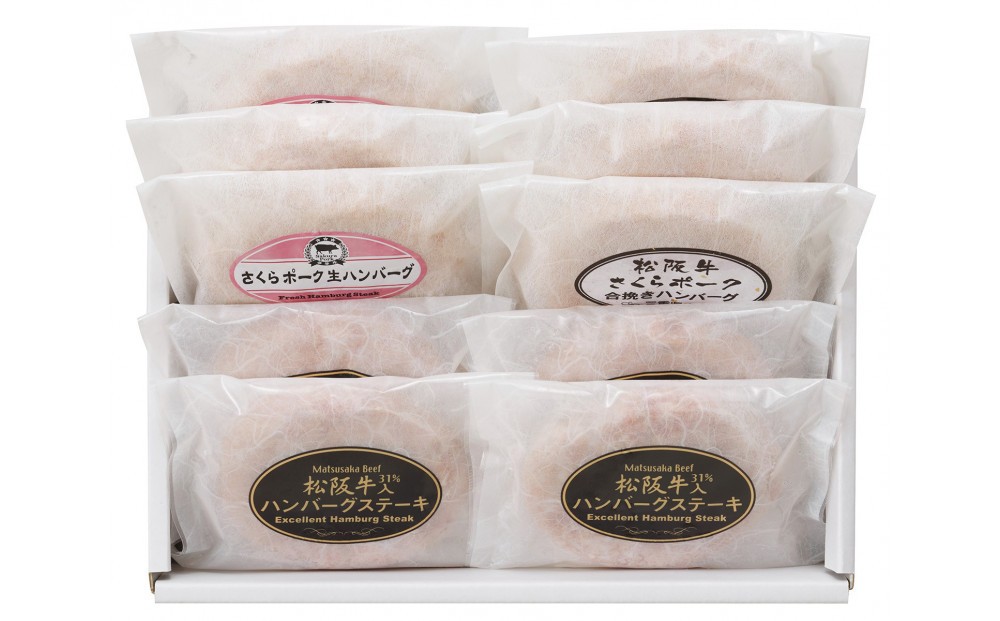 | 容量 | ・松阪牛入(31%使用)ハンバーグ 4個 ・さくらポーク生ハンバーグ 3個 ・松阪牛・さくらポーク合挽生ハンバーグ 3個 |