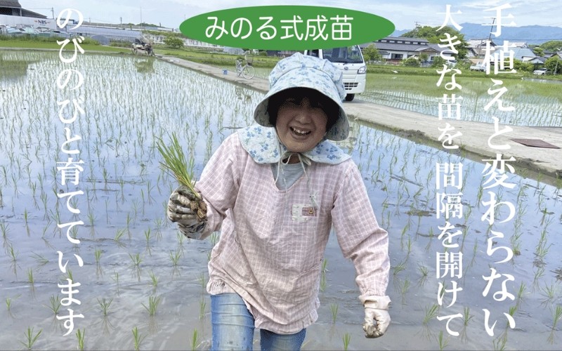 手間暇かけて大きく育てた苗をのびのびと育つよう広い間隔で植えているため、苗自体が元気なので農薬の使用を極力抑えた特別栽培米基準を満たしています。