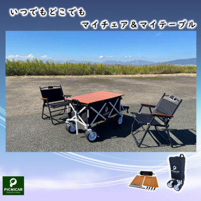 本返礼品は 【ピクニCAR (WHITE×BLACK)1台+ 木目調天板 】と【FOLDING CHAIR MB (BLACK)2脚】となります。