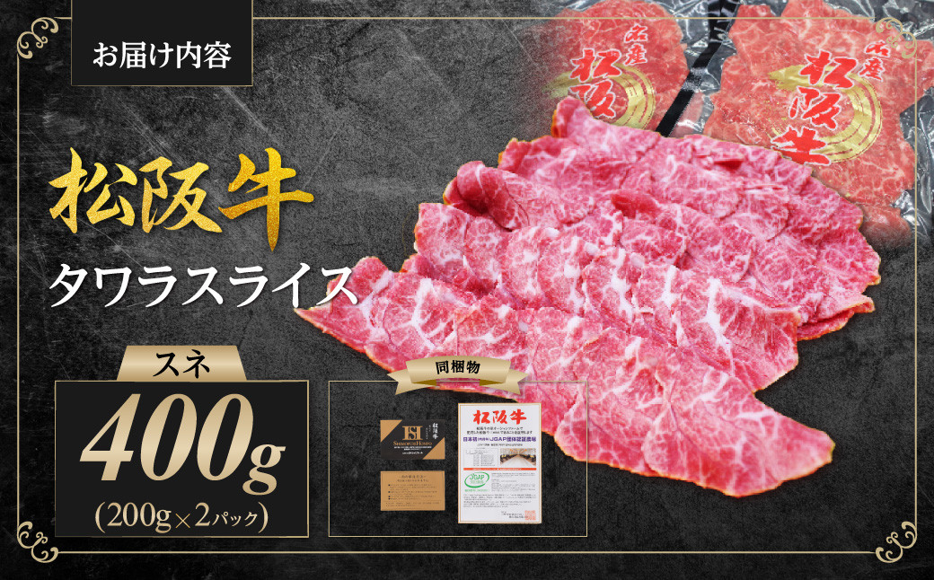日本初(肉用牛)JGAP団体認証農場からお届けする松阪牛! 松阪牛 すね肉 タワラスライス 400g(200g×2) 国産牛 和牛 ブランド牛 JGAP家畜・畜産物 農場HACCP認証農場 牛肉 肉 高級 人気 おすすめ 神戸牛 近江牛 に並ぶ 日本三大和牛 松阪 松坂牛 松坂 スライス 薄切り うす切り タワラ 前すね肉 スネ肉 脛肉 冷凍 三重県 多気町 SS-62