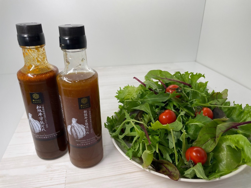 三重県立相可高校調理クラブの生徒さんと共同開発した黒にんにく入り松阪牛万能だれ、塩だれの2本セットです。 松阪牛をじっくり煮込むことでとろけるような旨みを引き出し、三重県産無臭黒にんにくの深いコクと合わせました。 万能だれは、炒め玉ねぎとりんごピューレでまろやかな甘みを加え、『炒める・かける・つける・煮る』などの幅広い料理に使えるよう仕上げています。 塩だれは、ガーリックオイルとごま油でコクを加え、黒トリュフオイルを隠し味にブレンドしました。 (万能だれ) 原材料名:砂糖(国内製造)、味噌(大豆を含む)、しょうゆ(小麦を含む)、みりん、炒め玉ねぎ、水あめ、りんごピューレ、食塩、発酵調味料、ごま油、でん粉分解物、ガーリックペースト、穀物酢、生姜ペースト、黒にんにくペースト、いりごま、酵母エキス、ビーフエキス、牛肉(松阪牛100%)、すりごま、香辛料 / 増粘剤(コンニャクイモ抽出物) (万能塩だれ) 原材料名:でん粉分解物(国内製造)、なたね油、しょうゆ(小麦・大豆を含む)、砂糖、食塩、にんにく風味香味油、ごま油、水あめ、ガーリックペースト、黒にんにくペースト、醸造酢、酵母エキス、レモン濃縮果汁、黒トリュフ風味香味油、魚介エキス、牛肉(松阪牛100%) / 調味料(アミノ酸等)、酒精、増粘剤(加工でん粉、増粘多糖類)、香料 保存方法:未開封の場合は直射日光を避け、常温で保存してください。開封後は開封済みのドレッシングは冷蔵庫で保存してください。
