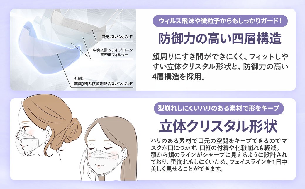 立体クリスタル形状を採用し、顔にフィットしやすく快適さ・デザイン性を追求したマスクで、つけ心地が良く、清潔で快適。4層構造で防御力がさらにアップし、さらに抗菌効果を追加し機能性アップしました。