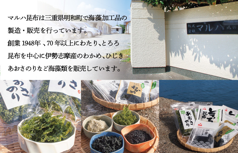 マルハ昆布は三重県明和町で海藻加工品の製造・販売を行っています。創業1948年、70年以上にわたりとろろ昆布を中心に伊勢志摩産のわかめ、ひじき、あおさのりなどの海藻類を販売しています。地元三重県のスーパーマーケットにも商品を展開するのはもちろん、全国各地のお客さまから注文が入ります。