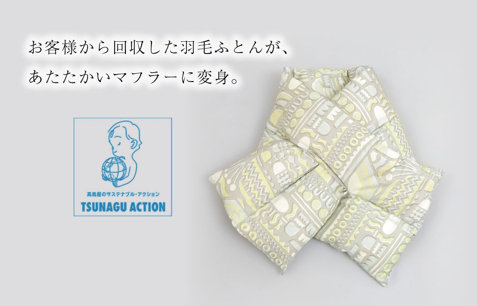 お客様から回収した羽毛ふとんを解体・洗浄し、あたたかなマフラーにアップサイクル。