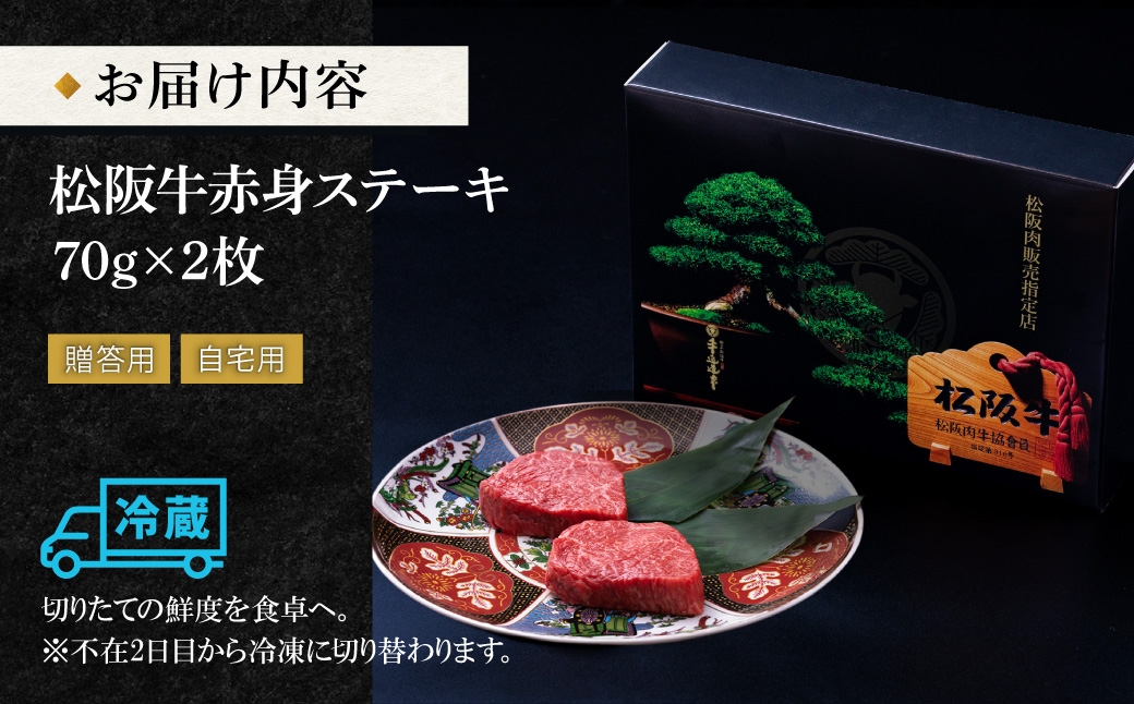 柔らかな肉質、とろける霜降り、甘く芳醇な香りが特徴の松阪牛を是非ご賞味ください。 松阪牛 赤身 ステーキ 70g×2枚 < 冷蔵 > 〔年末配送可〕 牛追道中 肉 牛 牛肉 和牛 黒毛和牛 ブランド牛 高級 国産 霜降り 焼肉 自宅 パーティー US10