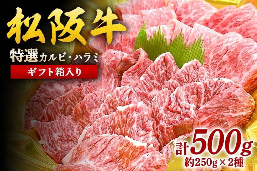 | 容量 | 各約250gずつ計500g/松阪牛焼肉用特選カルビ・ハラミ/ギフト箱入り |