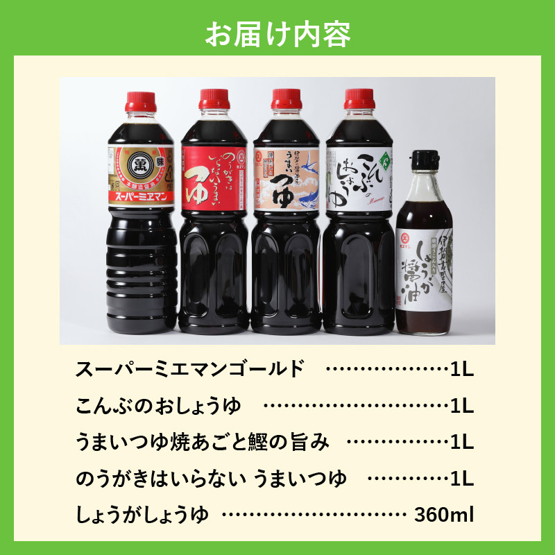 | 容量 | ・スーパーミエマンゴールド:1L ・こんぶのおしょうゆ:1L ・うまいつゆ焼あごと鰹の旨み:1L ・のうがきはいらない うまいつゆ:1L ・しょうがしょうゆ:360ml |