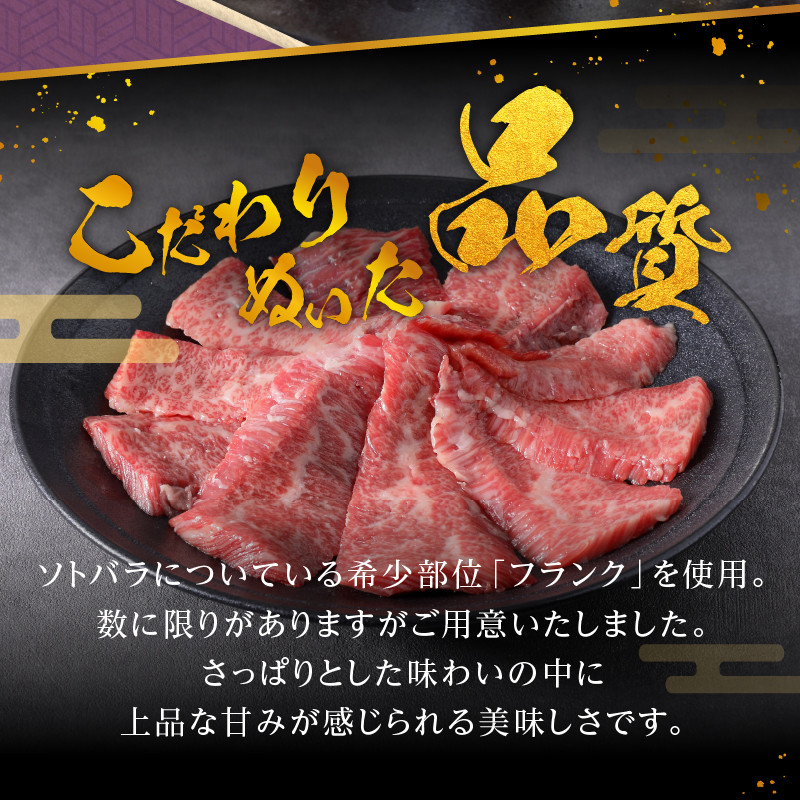 ソトバラについている希少部位の「フランク」を使用。 赤身とサシのバランスがよく、さっぱりとした味わいの中に上品な甘みが感じられる美味しさです。 数に限りがありますがご用意いたしました。 【調理方法】 解凍の際は、冷蔵庫の冷気の強い場所にて一晩かけてゆっくりと解凍して頂くとお肉にふたんが少なく解凍できます 【注意事項/その他】 ※お礼品が届きましたら中身の状態の確認を必ずお願いします ※画像はイメージです ※本品は新鮮なままお届けする為に冷凍にて発送致しております ※赤身肉(肩・モモ肉)はお肉同士が重なった部分が黒く変色する事があります。これはお肉が「空気に触れる事で赤く発色する性質」をもっており、重なった部分が空気に触れていないために黒くなる性質がある為です。品質や味には影響や問題はありませんので、安心してお召し上がりください ※30日間の賞味期限ですが、風味を損なわずおいしく召し上がっていただく為に2週間以内のお召し上がりをお勧めいたします ※商品パッケージは予告なく変更する場合がございますので、ご了承下さい ※返礼品につきましては、ご入金確認後にお品物の準備およびお届け対応を行います。 ご入金が遅れた場合には、お品物の在庫が無くなってしまうこともございますので、 予めご承知おきくださいますようお願いいたします。 ※2025年10月より寄付金額を変更しています。 【提供元】 ミライエ牛肉店 【地場産品に該当する理由】 区域内の牧場で肥育、生産されたもの(告示第5条第1号に該当) 【関連キーワード】数量限定 肉 牛肉 松阪牛 国産 霜降り 赤身 香り 甘み カルビ ささみ ささみカルビ 300g トレイ入り 舌触り 厳選 希少部位 冷凍 焼肉 バーベキュー キャンプ ミライエ 小林牧場 誕生日 お祝い 記念日 家庭用 三重県 玉城町産